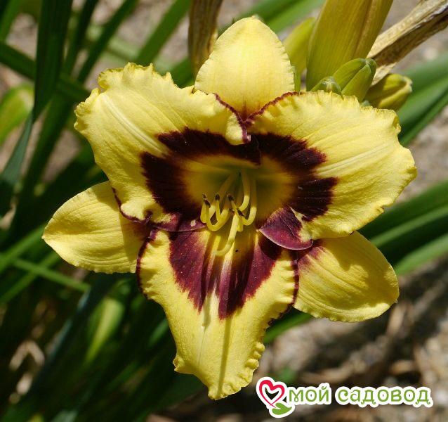 Цветоносы вырастают длиной 70 – 75 см. Прикорневые листья сочные, насыщенно-зеленого цвета. Весь сезон они достойно украшают участок. В полном роспуске диаметр цветков равен 14 см. Лепестки окрашены в желтый цвет. По краям они имеют пурпурную или вишневую кайму, а по центру – густые штрихи такого же цвета. Последние соединяются в центре и образуют «глаз» цветка. Период цветения наступает поздно – первые бутончики раскрываются в конце лета. Длится это удивительное зрелище 30 – 45 дней.