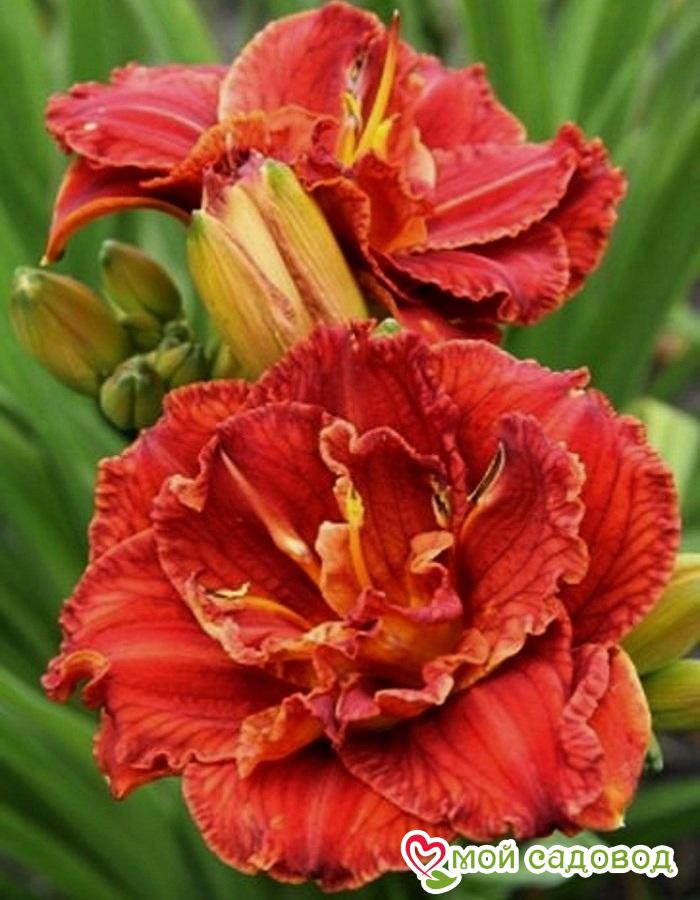 Куст вырастает размером до 65 см. Цветы у сорта махровые, яркие и пышные. В полном роспуске их диаметр равен 12 см. Лепестки окрашены в красный цвет. Цветение длится от 25 дней и более. Растение сохраняет декоративный вид до глубокой осени. Лилейник источает приятный и ненавязчивый аромат.