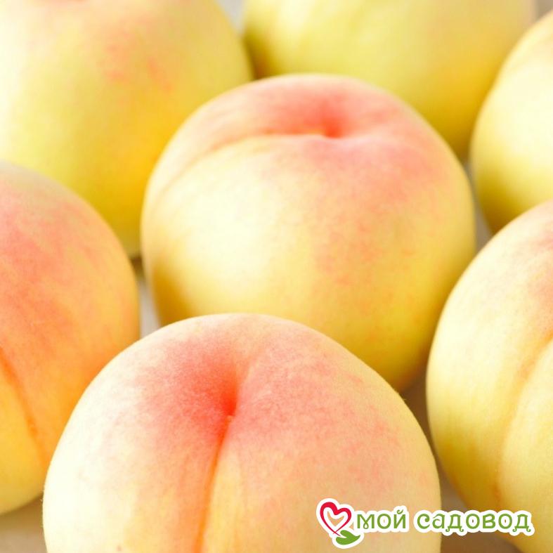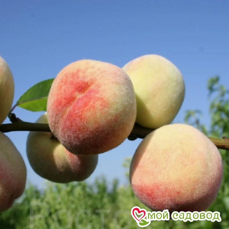 Плоды среднего размера, примерная масса 150-200 граммов. Персики округлые, широкоовальные, со светлой (кремовой) шкуркой, иногда может иметься румянец, но не обязательно, сверху опушены. Мякоть светло-желтая, почти белая, волокнистая. Косточка среднего размера, легко отделяется от мякоти.